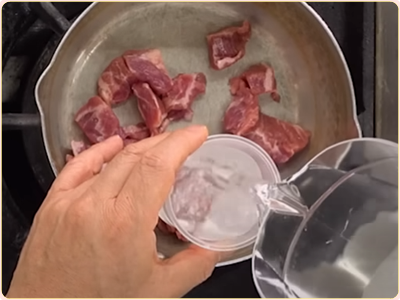 5) 냄비에 물 2.5L를 채우고 준비된 고기를 냄비에 바로 넣어요. 여기서 포인트는 바로 새우젓이나 참치액을 같이 넣고 끓여준다는 거에요. 고기의 기름이 찌개의 맛을 곰곰이 있게 해준다면 새우젓과 참치액은 감칠맛을 더해주는 역할을 하거든요.