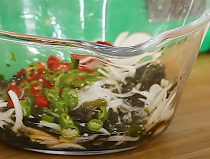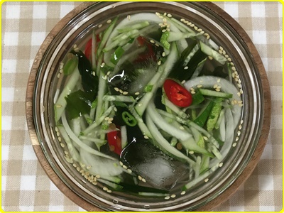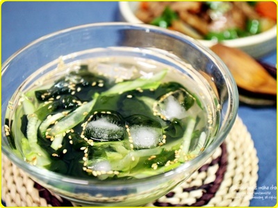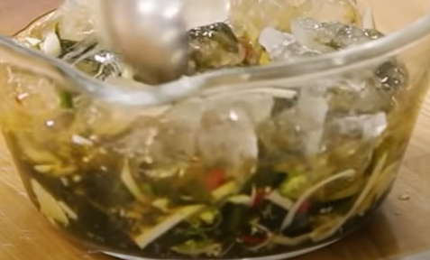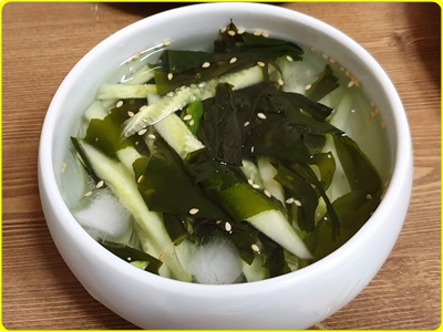 시원한 미역 오이냉국 바로 먹고 싶으면 얼음을 넣어서 먹어도 좋습니다. 대신 얼음이 녹으면서 국물의 간이 쇠락할 수 있으므로 조금더 간을 추가해서 준비하면 된다 하였습니다.
