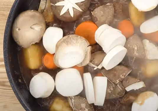 4. 무가 익을 즈음 당근, 새송이버섯, 표고버섯을 넣고 익혀줍니다. 이때 야채를 넣고 양념과 섞는 과정에서 무가 으깨질수 있으니 살살 섞어주는 것이 중요합니다.