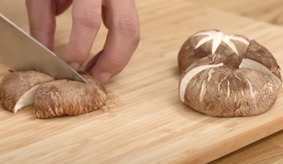 5. 갈비의 물기가 빠지는 동안 야채를 손질해 보도록 하겠습니다. 대파는 반으로 잘라서 송송 썰어줍니다. 새송이버섯은 밑동을 자르고 1cm 정도 두께로 썰어줍니다. 표고버섯은 버섯에 별모양을 내주거나 크기가 중간정도일 경우 1/4크기로 잘라서 준비합니다. 양파는 1/4크기로 잘라줍니다.