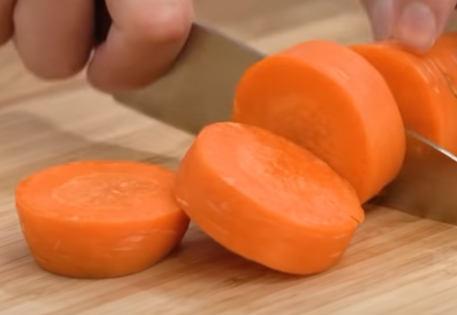 당근은 1cm 두께로 잘라주고 무는 1/8 정도 크기로 잘라 모서리를 깔끔하게 정리해 줍니다. 이때 감자칼을 사용해서 모서리만 잘라주면 됩니다. 그리고 추가로 색깔을 내주는 대파 3대는 2~3cm 크기로 썰어서 준비합니다. 마지막으로 홍고추, 청양고추, 꽈리고추를 2등분 혹은 3등분 해줍니다.