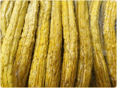 1) 맛이게 잘익은 오이지를 먹기 좋은 크기로 잘라준 다음 물에 15분간 담가 둡니다. 이 과정은 짠맛을 사라지게 하기 위함이고요. 물에 15분간 담가 두는데 물은 2번 가량 갈아 주는 것이 바람직해요. 물에 담가두는 시간은 오이 맛을 봐서 간으로 확인하면 되어요.