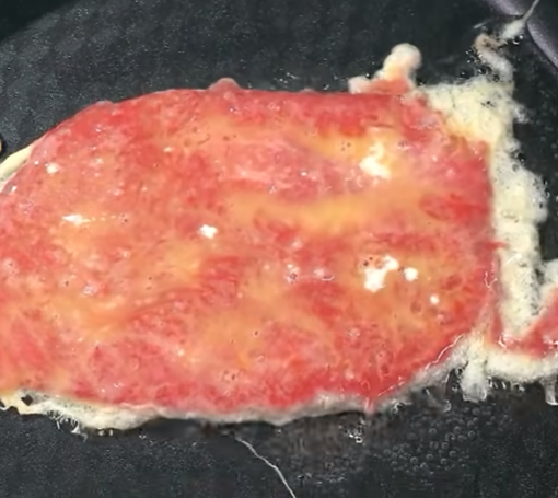 6) 기름을 둘러서 달궈진 후라이팬에 계란물 입힌 소고기를 올려줍니다.