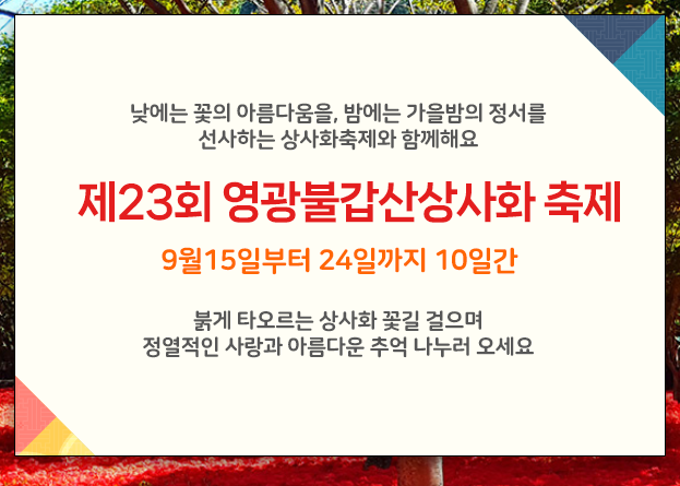 세계 최대의 상사화 군락지가 있는 곳입니다. 천년의 역사를 담아낸 고찰 불갑사가 있는 불갑산에는 매년 9월이 되면 붉은 상상화가 물결을 이룹니다. 2001년에 처음 시작된 상상화축제는 천년의 사랑 속으로, 상사화 꽃길 속으로라는 슬러건으로 23회 축제를 맞이 했습니다. 가을 정취를 흠뻑 느끼면서 동시에 정열의 꽃 상사화와 아름다운 추억을 만들수 있는 축제입니다.