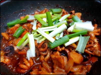 6) 야채와 쭈꾸미에서 나온 국물이 어느만치 자작해지면 대파를 넣고 통깨와 참기름으로 마무리 해주면 되기도 합니다. 이때 대파는 미리 넣어줘도 되기도 합니다. 음식을 넣는데 순서가 있다고하지만 야채를 넉넉히 익힐 것이 아니기 때문에 다른 야채를 넣을 때 아울러 넣어줘도 문제는 없습니다. 근래 고장이 철이라고 해서 그런지 많이 넣으면 달달하고 매력있는 대파의 식감을 만끽할 수 있다고 합니다.