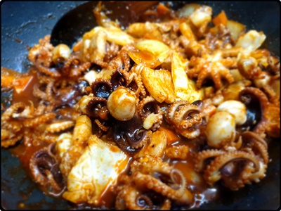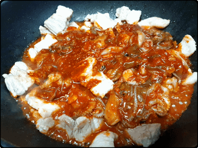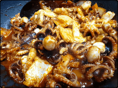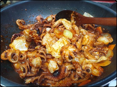 3) 쭈꾸미에 물기가 빠지면 미리 숙성시킨 양념에 쭈꾸미를 넣고 잘 섞어준답니다. 혹시 범위가 큰 쭈꾸미가 있으면하는 미리 잘라줘도 된다 하였습니다. 그렇지 아니하면 익는 스탭에서 잘라줘도 관계없습니다. 쭈꾸미 볶음을 할 냄비를 준비합니다. 아주 드물게 삼겹살을 구웠던 냄비가 있으면하는 삼겹살이 있는 처지에서 양념장에 버무린 쭈꾸미를 넣고 볶아줘요. 쭈꾸미 다리가 안쪽으로 말리면서 익어가면 쭈꾸미, 삼겹살 그리고 양념이 어우러집니다.