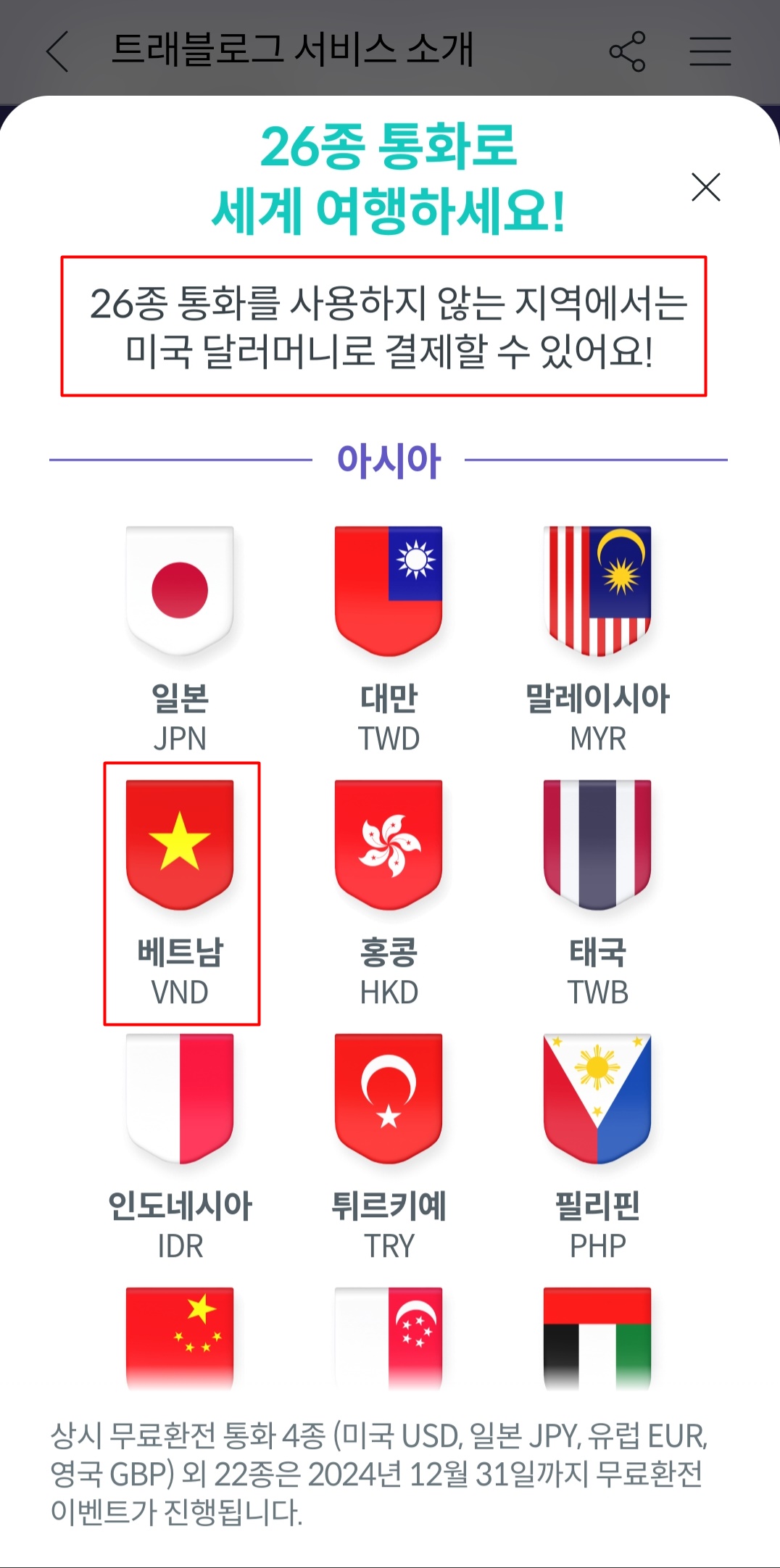 2. 화면 중간에 있는 무료환전 항목을 클릭합니다. 그리고 베트남 VND의 충전을 선택합니다.