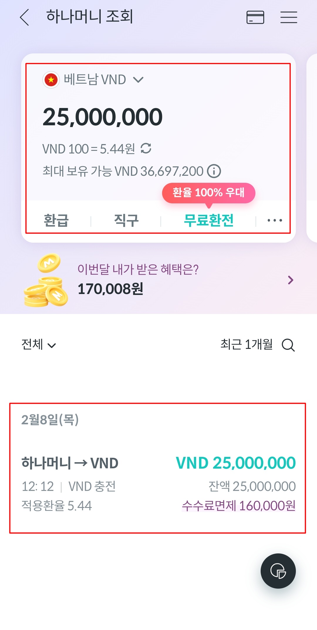 6. 충전된 금액을 바로 확인할 수 있습니다. 그리고 베트남 푸꾸옥 항공권을 결제하고 나니 바로 잔액이 업데이트 됩니다. 원화를 베트남 동으로 환전할 때 수수료를 면제받게 됩니다. 그리고 베트남 동으로 비엣젯 항공권을 예약했더니 추가로 수수료 면제를 받았습니다.