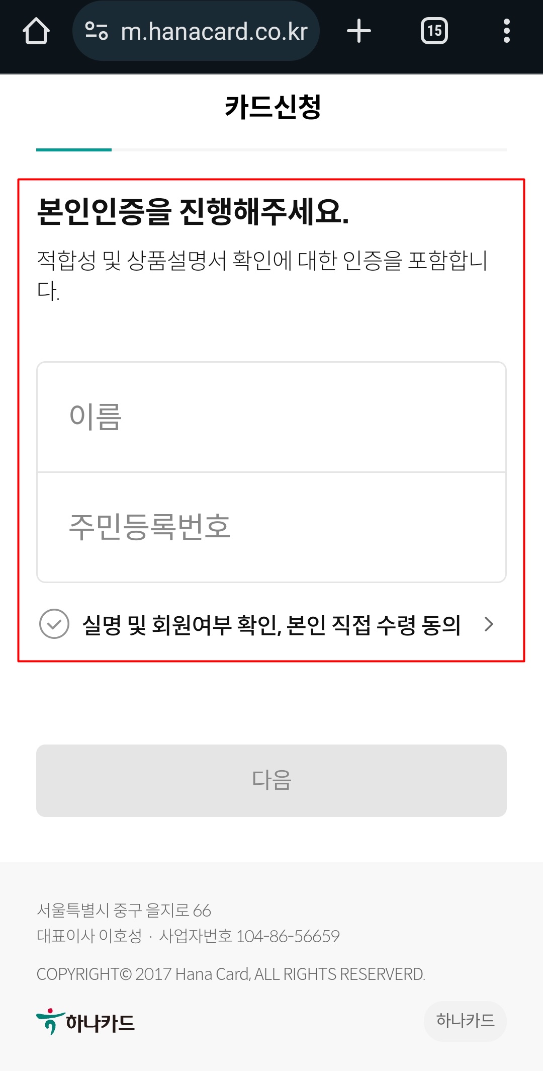 4. 다음으로 본인 인증 단계를 진행합니다. 이름, 주민번호 입력 및 직접 수령에 동의하고 다음으로 휴대폰, 토스, 네이버, PASS, 카드 등 인증방법을 선택한 후 개인 인증을 완료합니다.