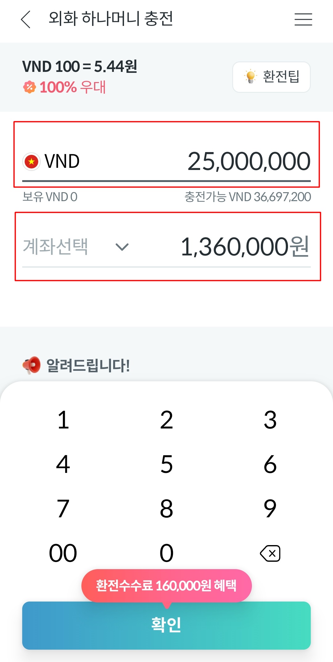 3. 다음화면에서 VND의 "외화로 입력란"에 충전할 베트남 동을 입력해줍니다. 그리고 환전할 계좌를 선택합니다. 그렇게 하면 입력한 베트남 동의 해당하는 원화가 입력됩니다.