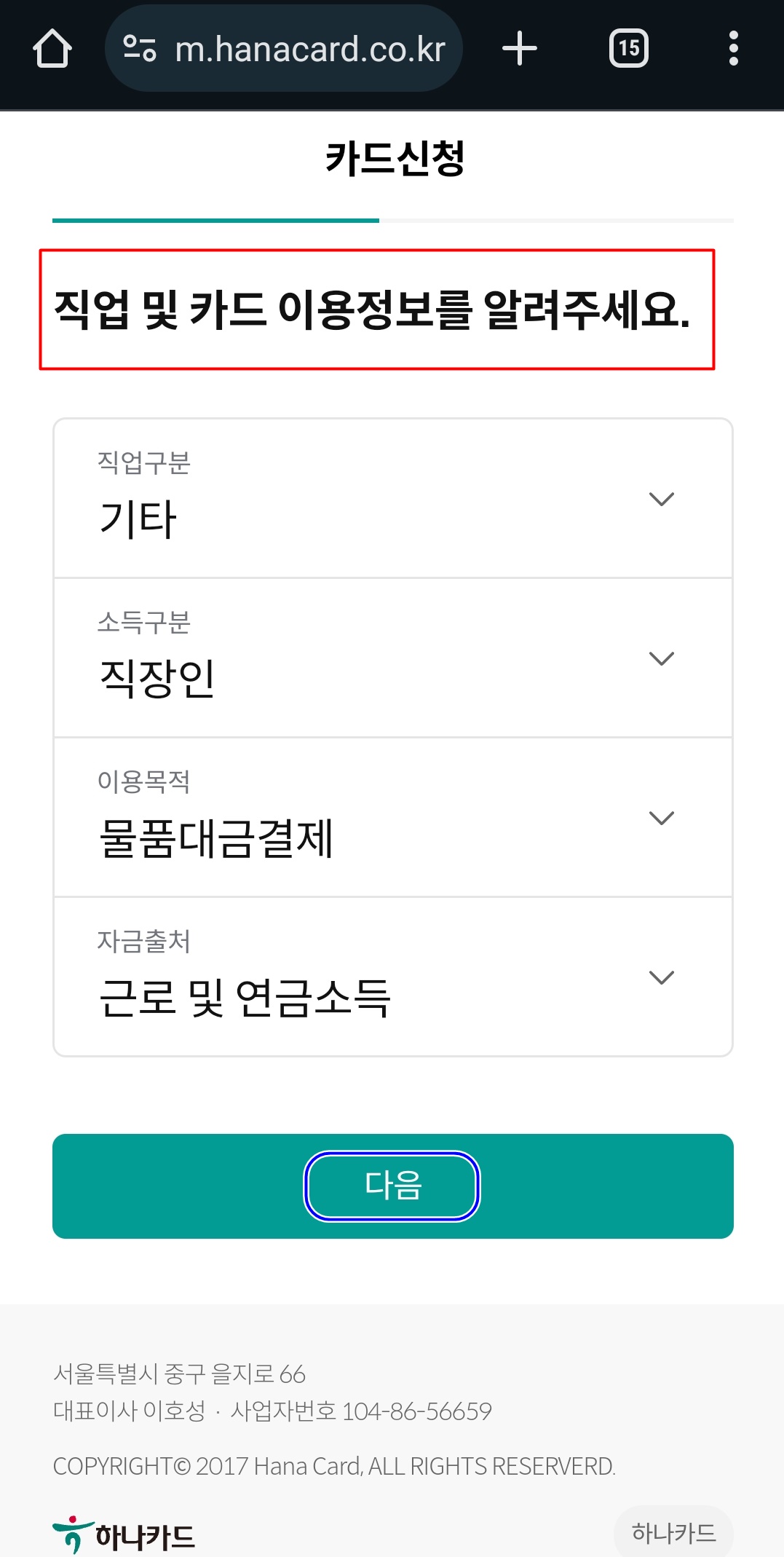 6. 직업 및 카드 이용정보를 선택하고 카드 수령지를 입력해 줍니다.